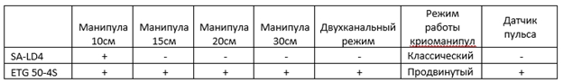 Аппарат SA-LD4 оснащён одной малой рукояткой криолиполиза, в то время как ETG 50-4S уже в базовом наборе имеет четыре рукоятки от 10 до 30 см и возможность работать двумя рукоятками одновременно. Также имеется возможность доукомплектовать аппарат двумя одинаковыми манипулами и проводить процедуру сразу симметрично. Дополнительно аппарат ETG 50-4S оснащён датчиком пульса и кнопкой экстренного отключения для клиента.