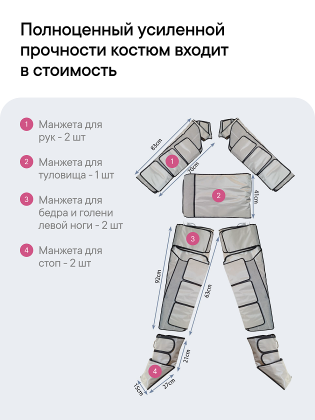 Аппарат для прессотерапии помогает стимулировать лимфоток, уменьшить отёки и улучшить тонус кожи. В нём сочетаются функции инфракрасного прогрева, лимфодренажа и массажа, что делает его удобным решением для салонов красоты, медицинских кабинетов и оздоровительных центров.